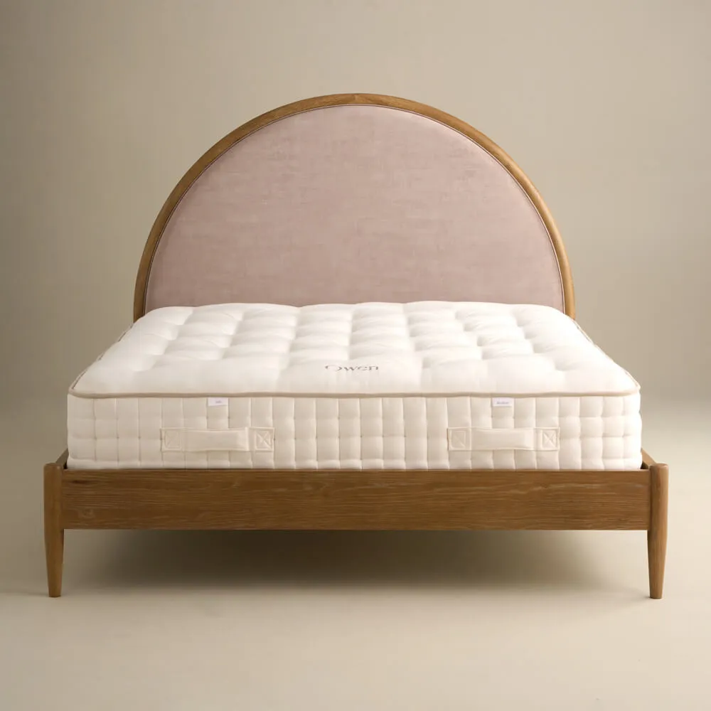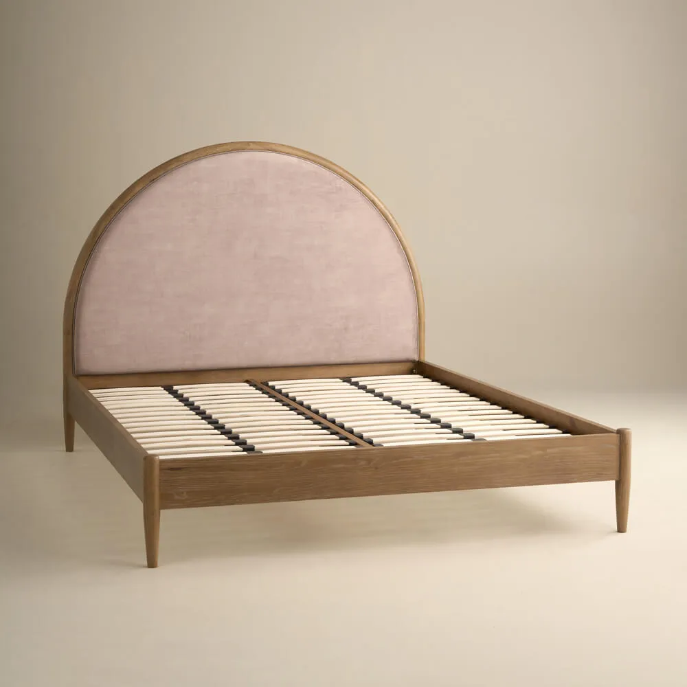 Chic king size bed with iconic arch headboard. Taupe velvet upholstery on a warm weathered oak frame, sprung slatted base, and low foot end create a stylish, comfortable, and practical bedroom centerpiece.