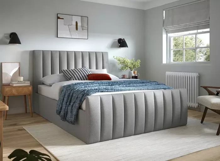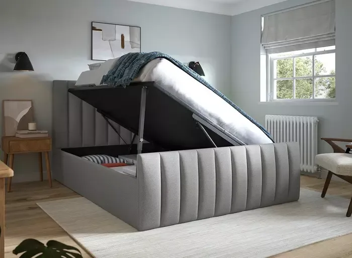 Luxurious king size ottoman bed with plush fluted headboard and foot end. Soft-touch upholstery in grey and 30 cm underbed storage combine style, comfort, and practical space-saving for a clutter-free, cosy bedroom.
