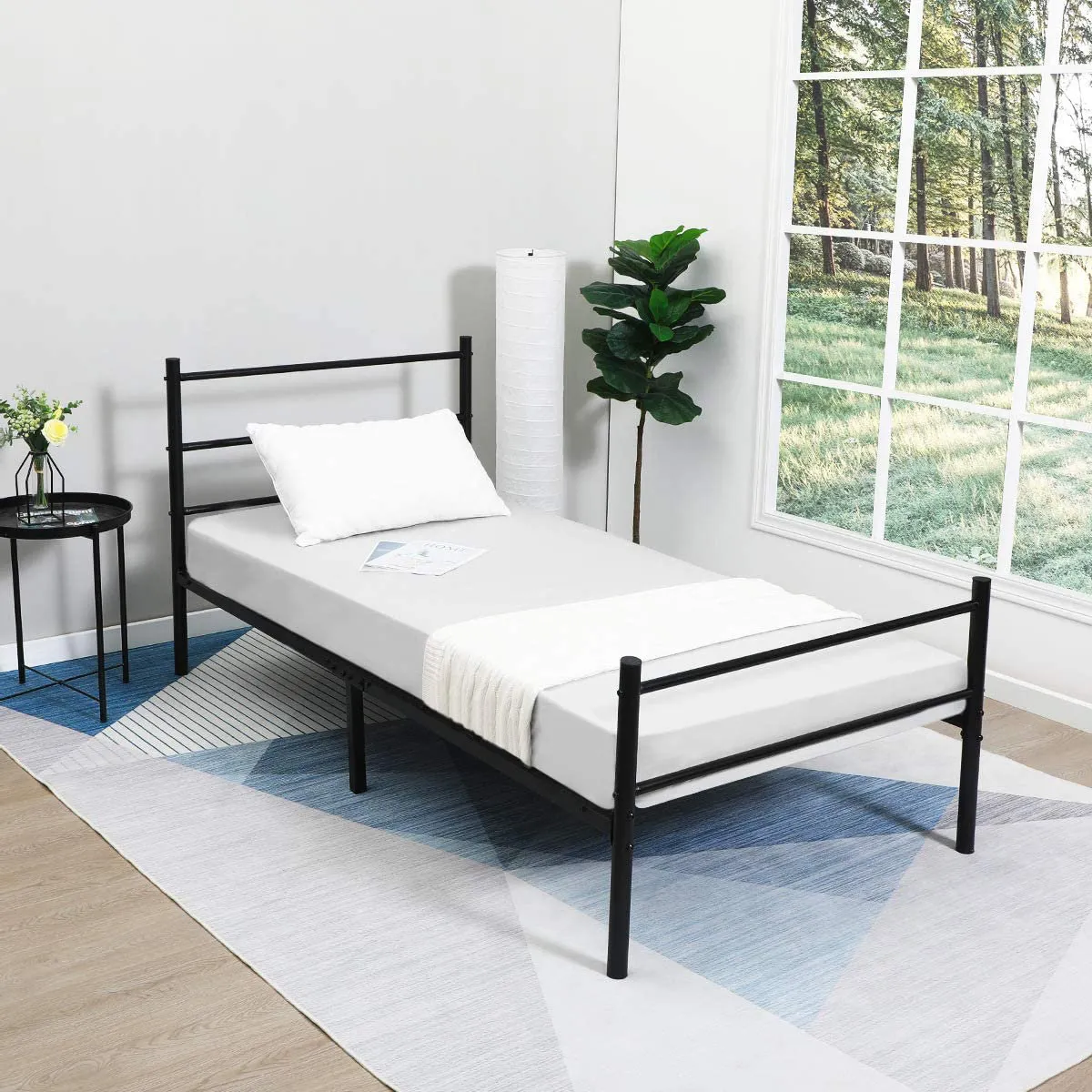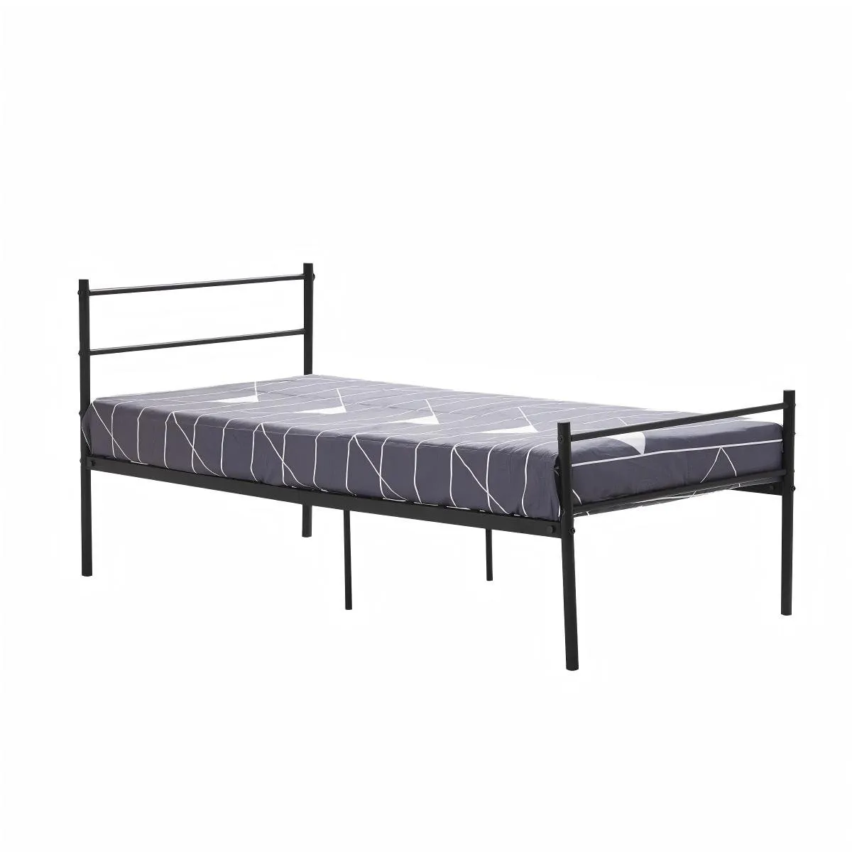 Single metal bed with vintage-style headboard and footboard. Slat system supports the mattress without a box spring, while 32.5 cm underbed clearance offers ample storage. Sturdy, stable, and easy to assemble—ideal for small bedrooms, studios, or dorms.