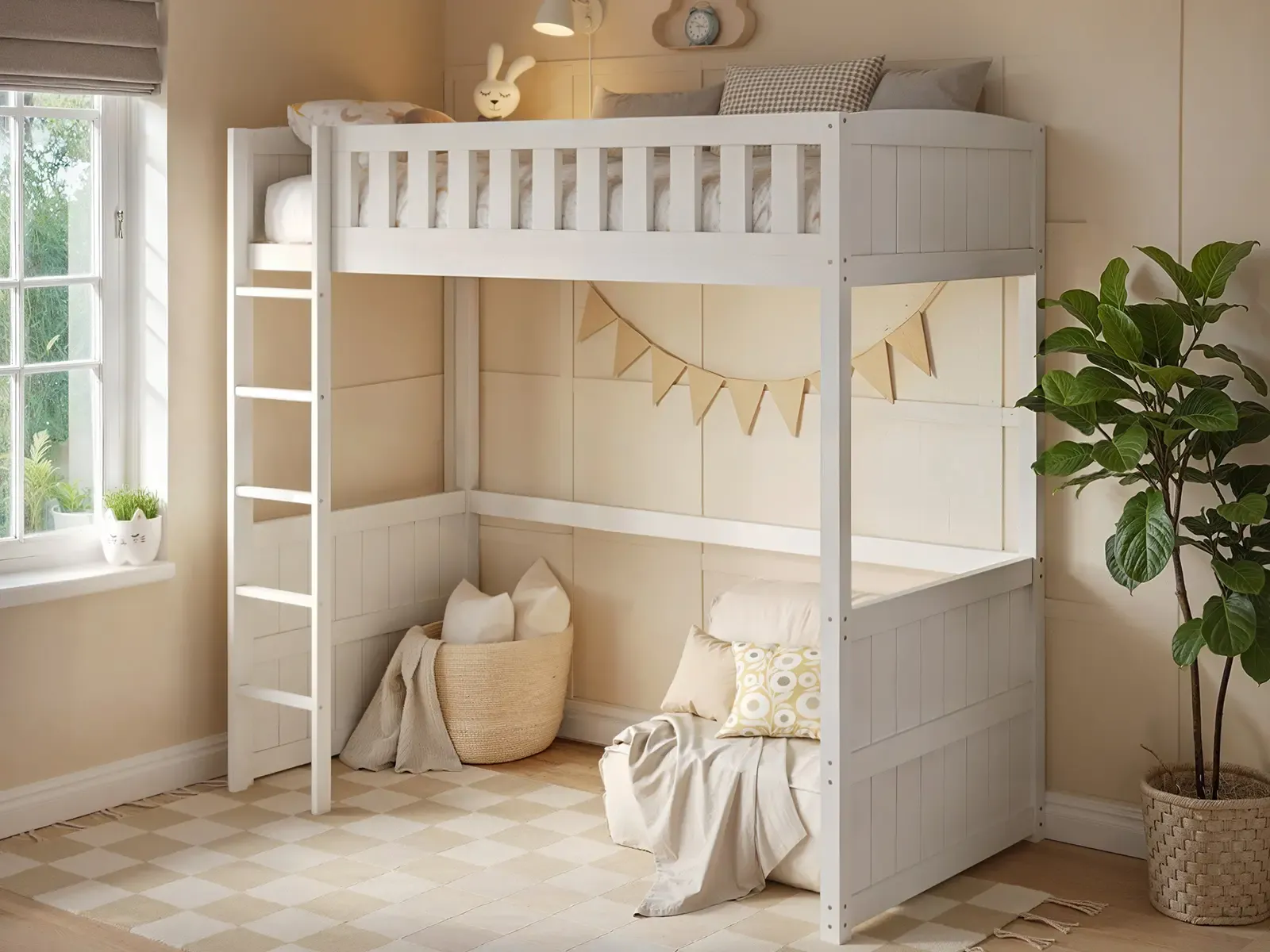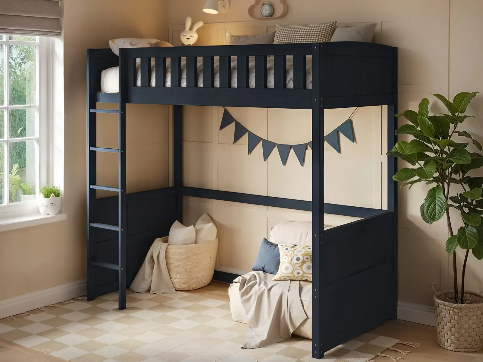 Elevated kids wooden bed with safe guardrails and sturdy frame. Space underneath for study, storage, or play. Available in White, Navy Blue, and Oak, perfect for smaller bedrooms with a timeless, stylish design.