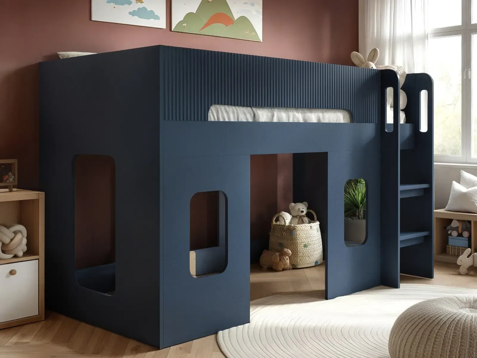 Kids mid sleeper bed with playful cut-out windows and raised design. Wide-step ladder for safe climbing, underbed space for play or reading. Durable construction in Navy Blue, Oak, or White with textured panels.