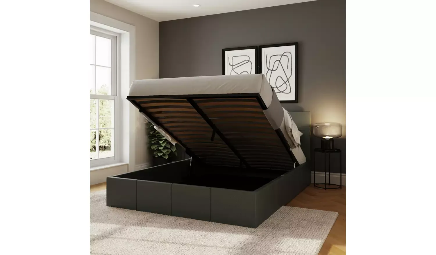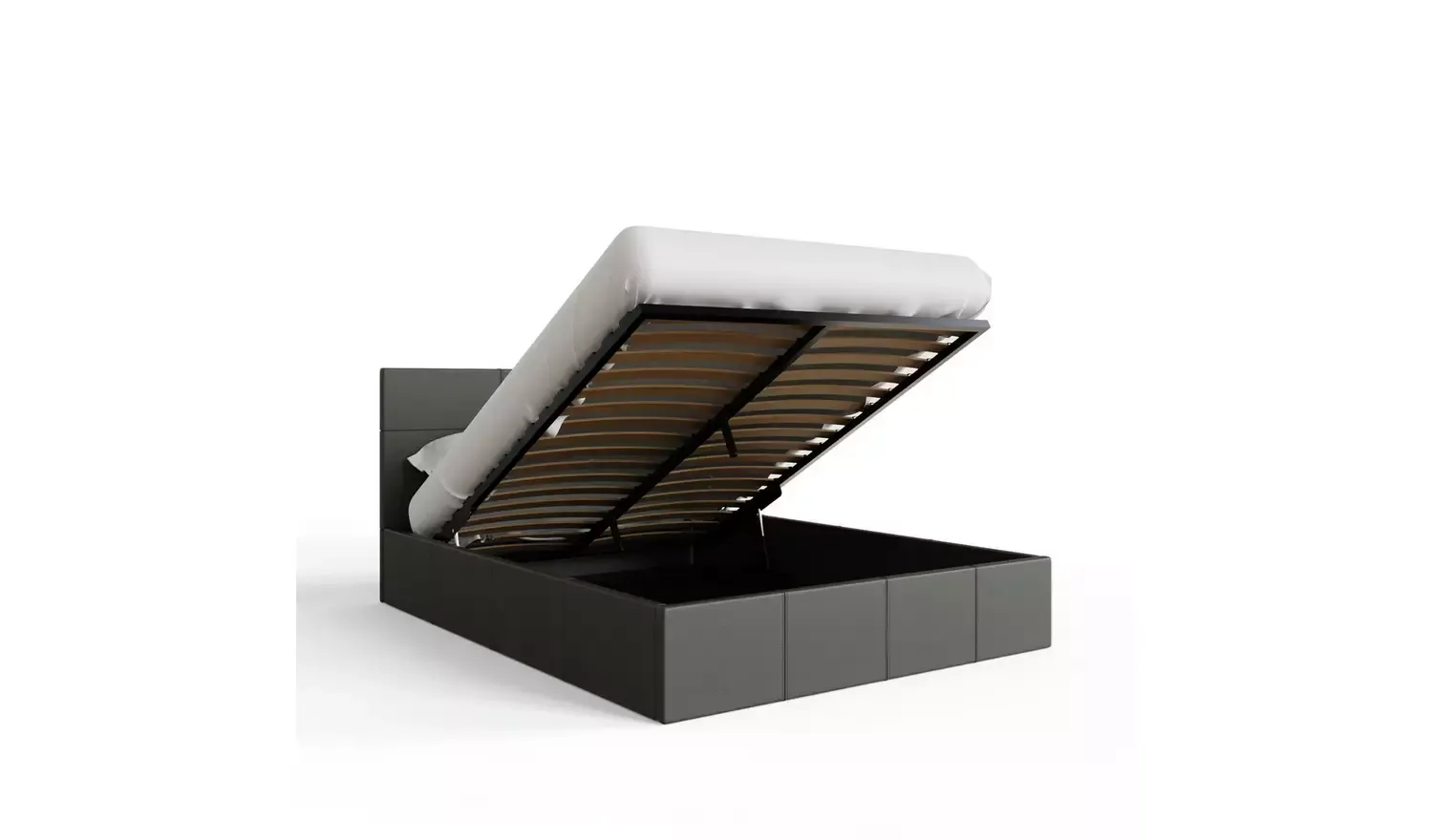 Upgrade your bedroom with this modern kingsize ottoman bed finished in stylish grey faux leather. The smooth gas-lift mechanism reveals generous hidden storage, perfect for keeping linens and essentials organized. With a stitched headboard and sprung slatted base, it combines comfort, durability, and space-saving functionality.