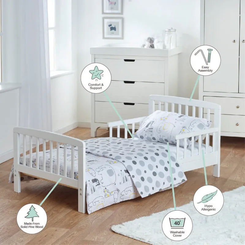 This Toddler Bed bundle includes a solid pinewood frame, fibre mattress, pillow, duvet and Safari Friends bedding set. Designed with side rails and sturdy slats, it offers safety, comfort and easy maintenance for toddlers transitioning from a cot.