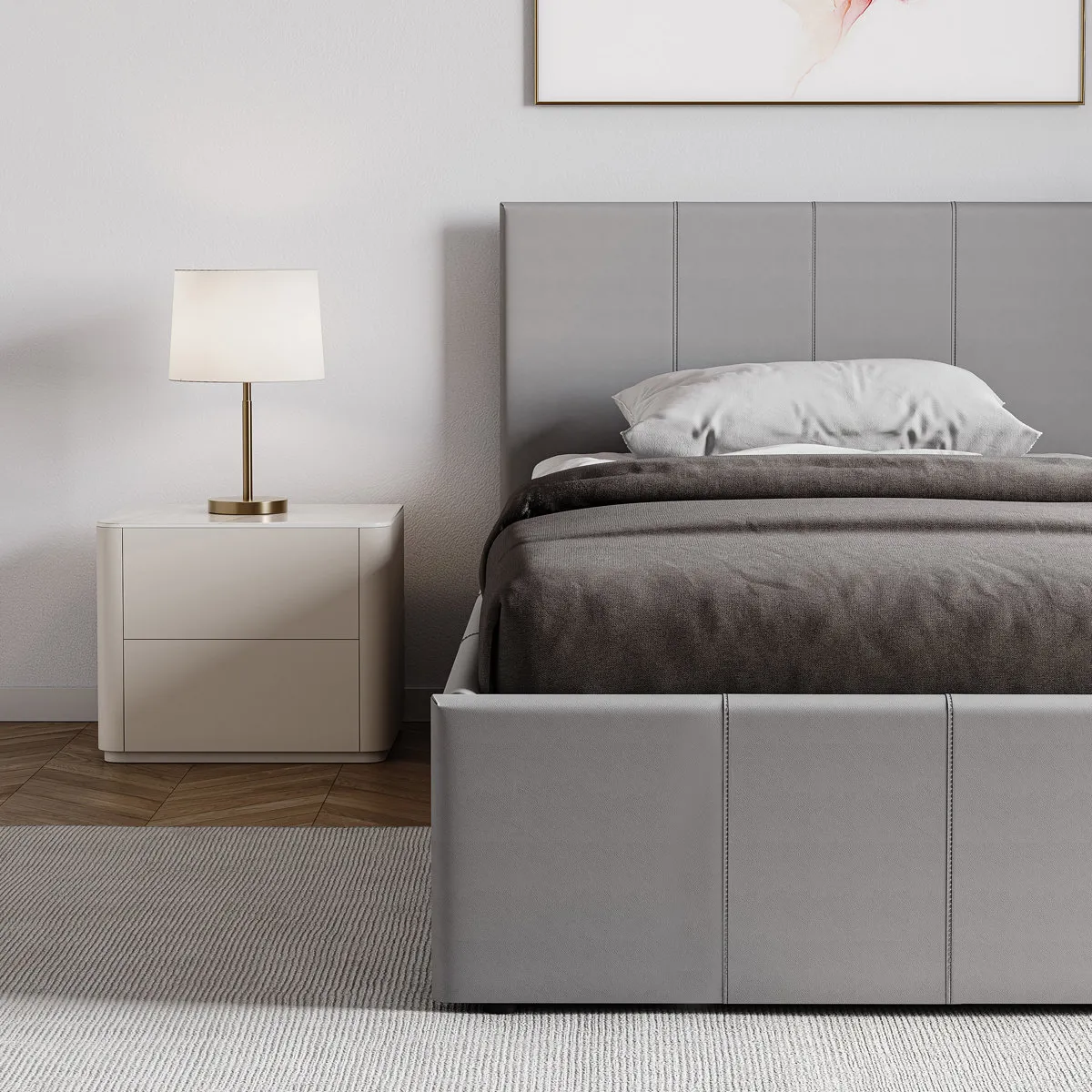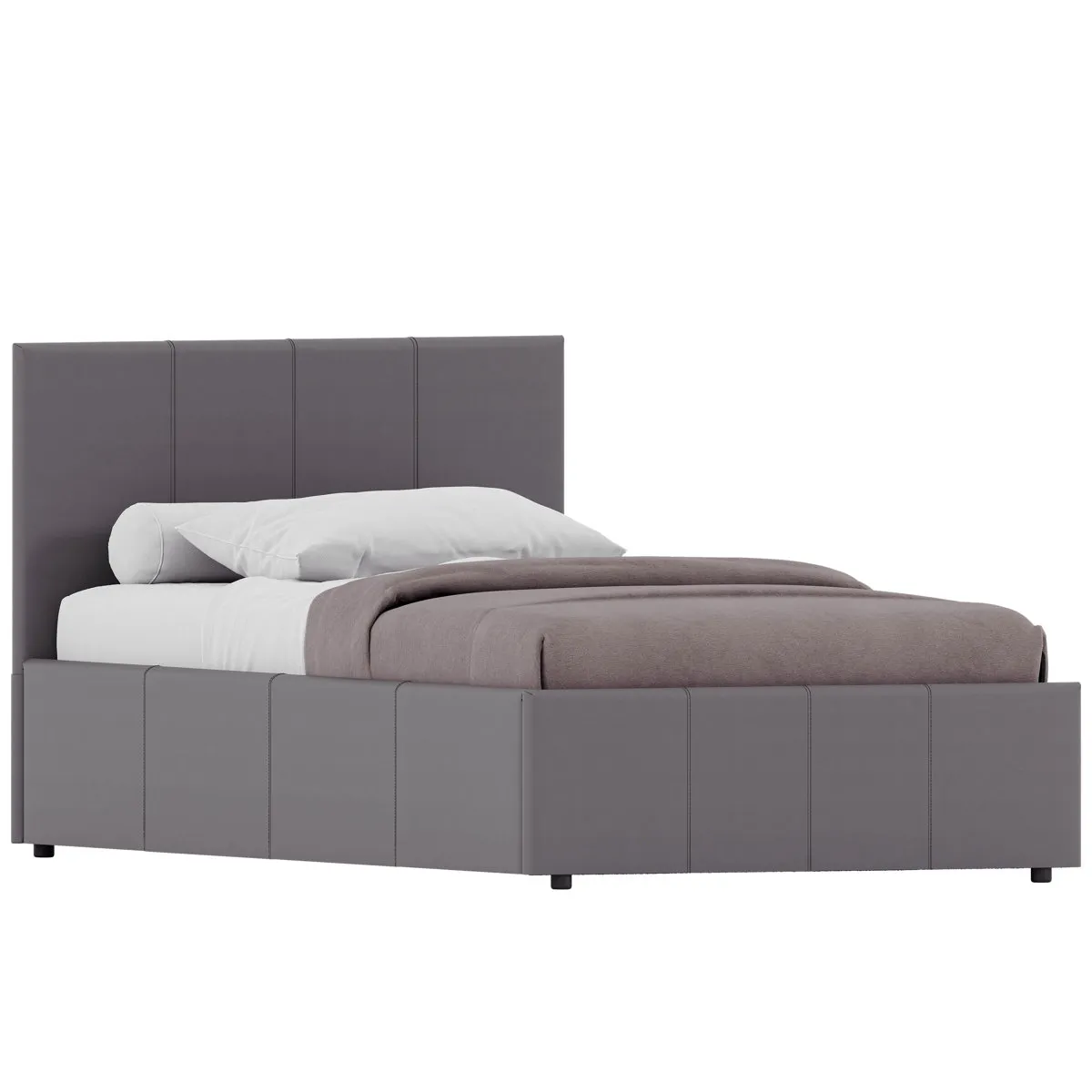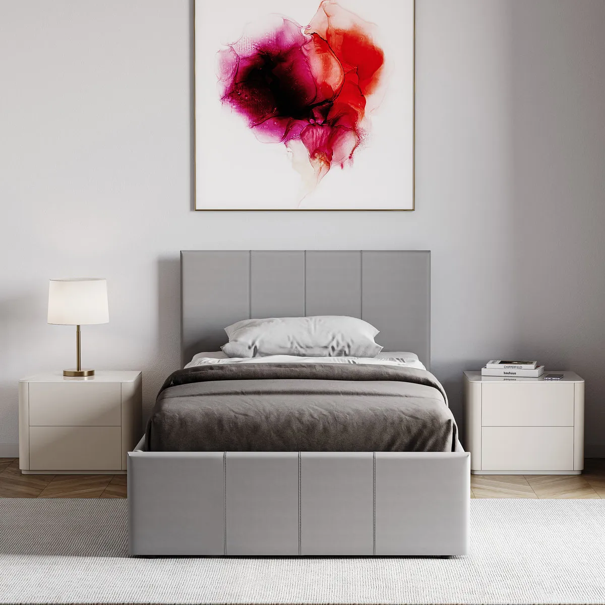 Single ottoman bed with faux leather or corduroy upholstery and rectangular headboard. Lift-up underbed storage keeps belongings tidy. Wooden slats provide strong mattress support. Stylish, durable, and practical for bedrooms of any size.